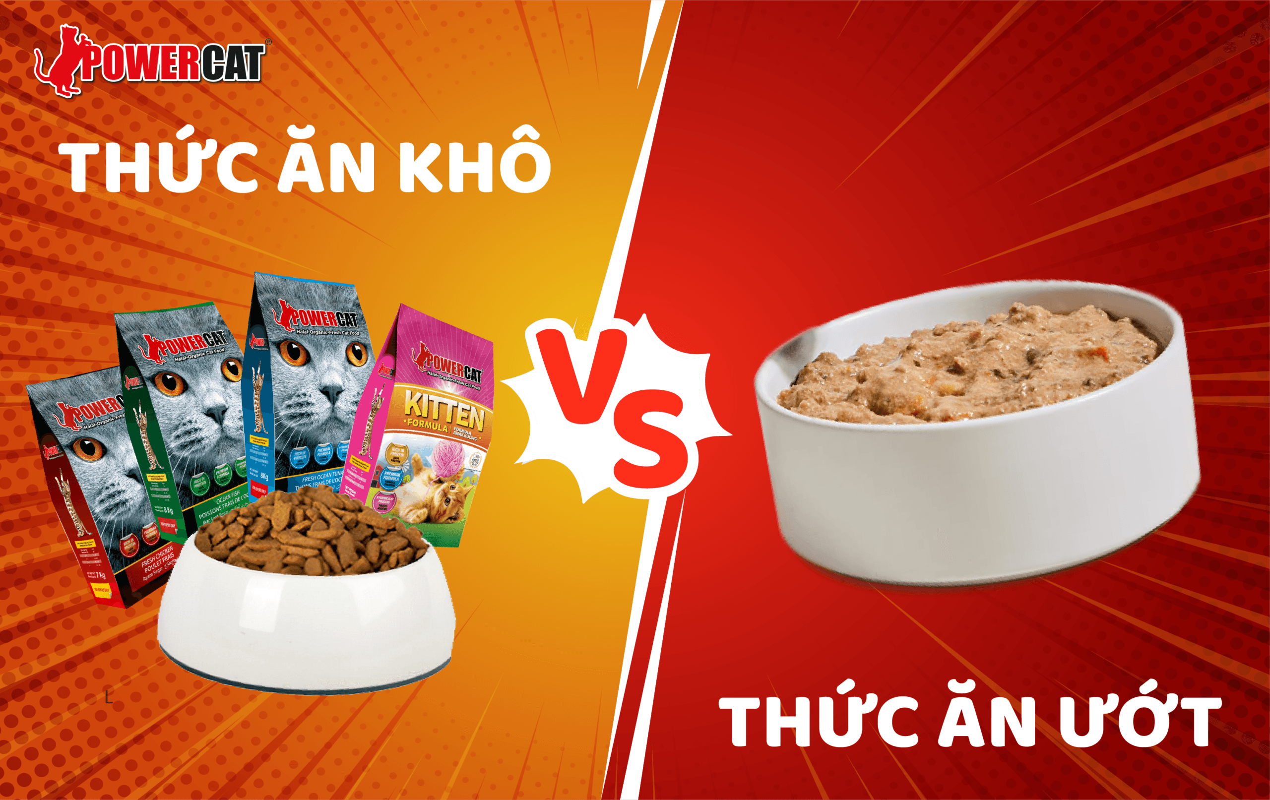Thức ăn khô hay thức ăn ướt tốt hơn cho mèo? 2 loại thức ăn mèo phổ biến nhất hiện nay là thức ăn khô (hạt) và thức ăn ướt (pate, đồ hộp). Hãy cùng thức ăn mèo Powercat tìm hiểu về đặc điểm của từng loại thức ăn cho mèo trong bài viết này!